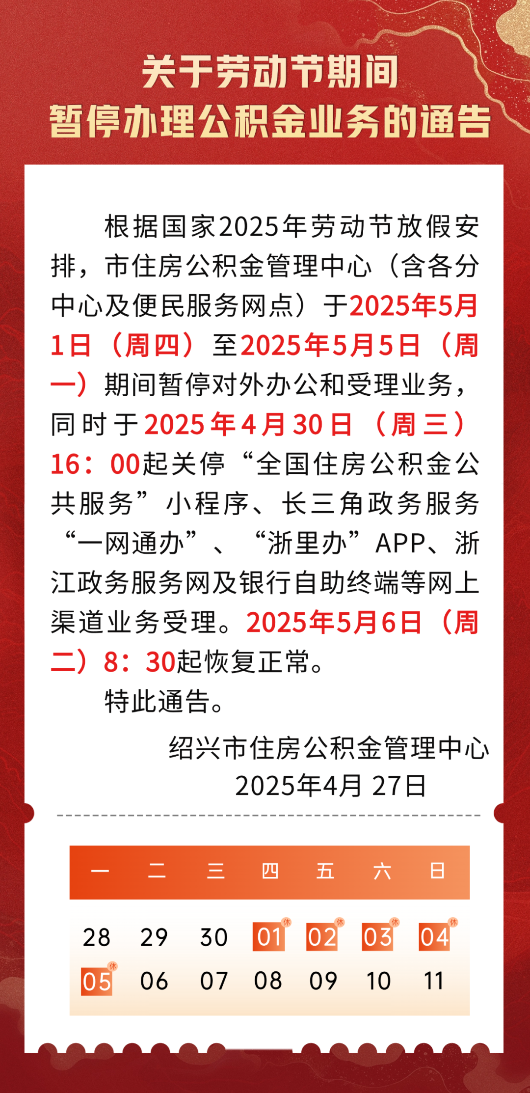 關(guān)于公積金綜合業(yè)務(wù)系統(tǒng)升級切換的停業(yè)通告各繳存單位、繳存職工:根據(jù)紹興市公積金綜合業(yè)務(wù)系統(tǒng)升級切換工作安排,我市公積金政務(wù)服務(wù)中心窗口及公積金便民服務(wù)網(wǎng)點將于2025年3月24日(周一)—2025年3