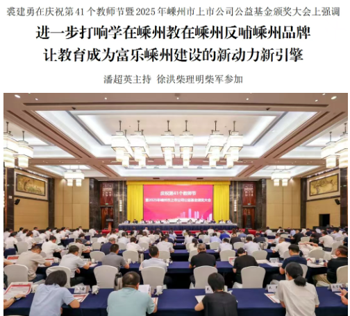 9月8日下午,我市召開慶祝第41個教師節(jié)暨2025年嵊州市上市公司公益基金頒獎大會。市委書記裘建勇出席并講話,強調要深入學習貫徹習近平總書記關于教育的重要論述,堅定信心、乘勢而上,進一步打響“學在嵊州