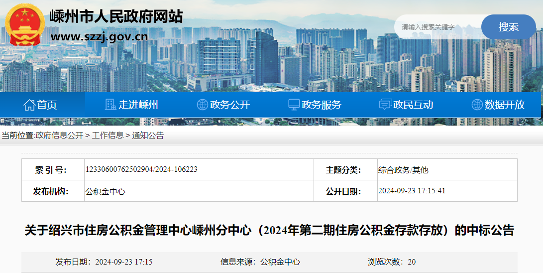 一、招標人名稱:紹興市住房公積金管理中心嵊州分中心二、招標項目名稱:紹興市住房公積金管理中心嵊州分中心(2024年第二期住房公積金存款存放)三、招標項目編號:SXPZ-F20240904CKY四、招標