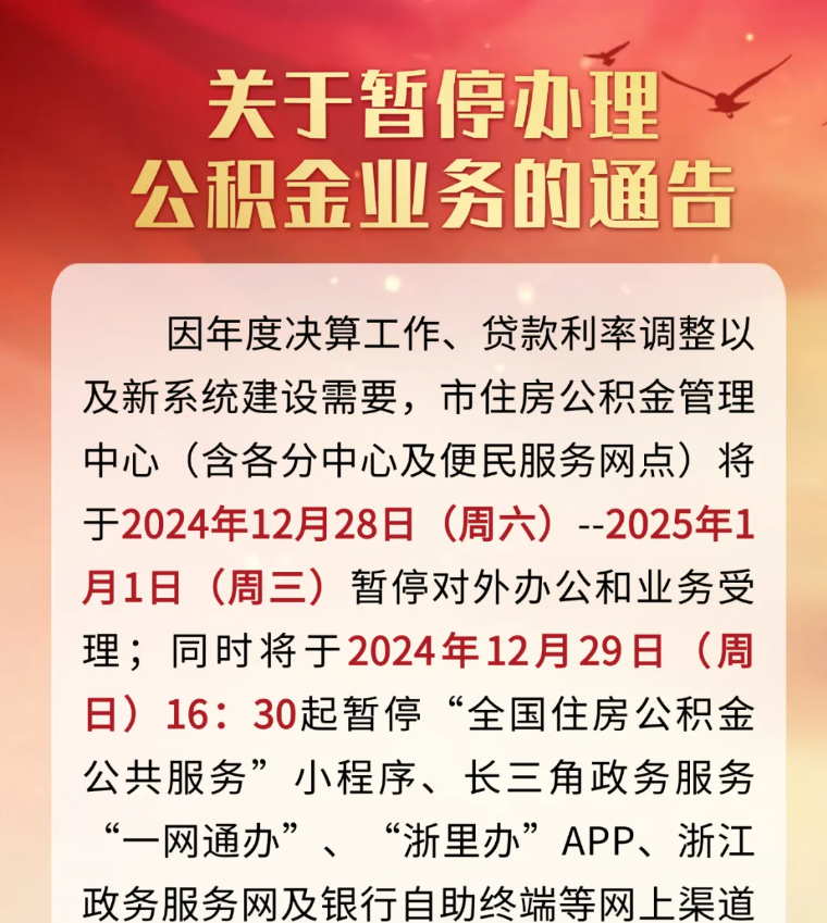 關于暫停公積金網(wǎng)辦業(yè)務的公告各繳存單位及職工:9月22日(周日)上午,因省廳對“浙江省住房公積金互聯(lián)網(wǎng)+綜合服務系統(tǒng)”等數(shù)據(jù)庫進行遷移維護。為確保該工作順利進行,決定暫停該時段“浙里辦”和“浙江政務服