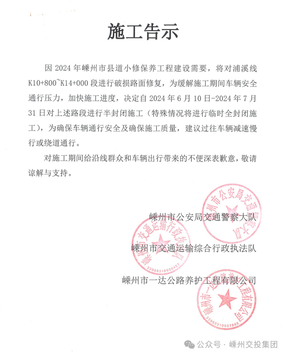 小編獲悉,因2024年嵊州市鄉(xiāng)村振興聯(lián)網(wǎng)道路改擴(kuò)建工程(甘霖—貴門(mén))建設(shè)需要,為保證工程順利施工和施工期間道路交通安全,決定對(duì)以下道路進(jìn)行封閉施工:1.自2024年8月5日至2024年9月30日,對(duì)甘