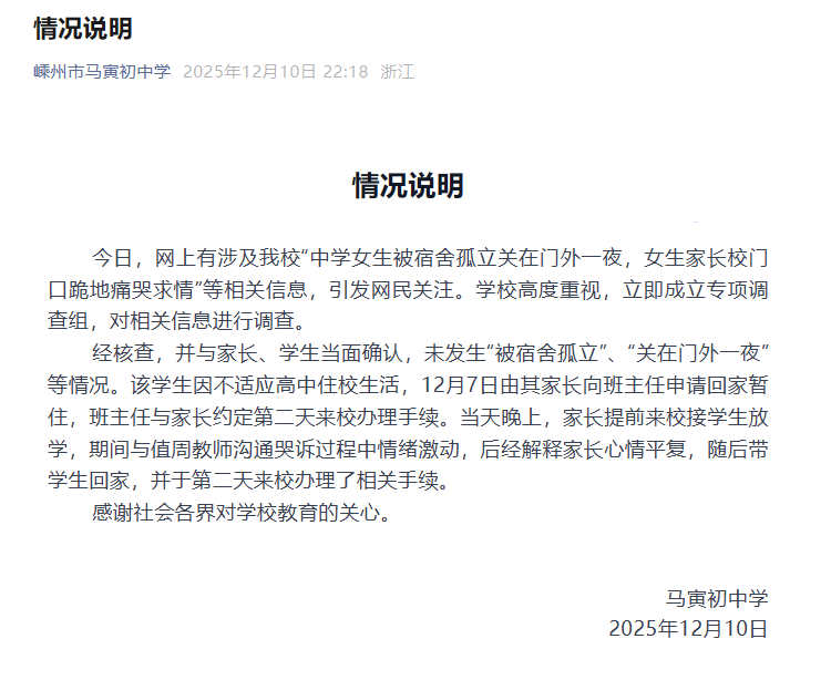 12月10日,紹興嵊州市馬寅初中學(xué)發(fā)布一則情況說明。·情況說明·今日,網(wǎng)上有涉及我?!爸袑W(xué)女生被宿舍孤立關(guān)在門外一夜,女生家長(zhǎng)校門口跪地痛哭求情”等相關(guān)信息,引發(fā)網(wǎng)民關(guān)注。學(xué)校高度重視,立即成立專項(xiàng)調(diào)