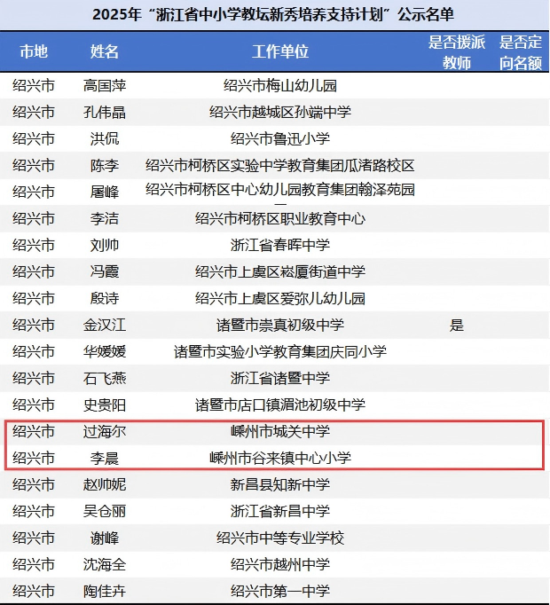 根據(jù)《浙江省人民教育基金會(huì)浙江省特級(jí)教師協(xié)會(huì)關(guān)于實(shí)施“浙江省中小學(xué)教壇新秀培養(yǎng)支持計(jì)劃”的通知》(浙教基金〔2025〕1號(hào)),經(jīng)教師申報(bào),學(xué)校、縣、市教育局逐級(jí)審核推薦和省級(jí)確認(rèn),確定278人為202