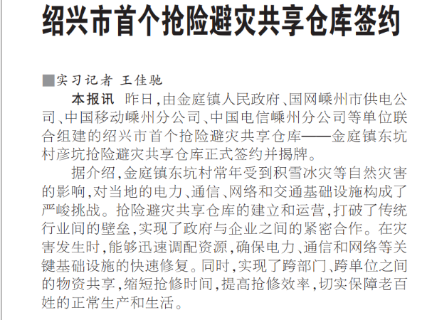 昨日,由金庭鎮(zhèn)人民政府、國網(wǎng)嵊州市供電公司、中國移動嵊州分公司、中國電信嵊州分公司等單位聯(lián)合組建的紹興市首個搶險避災(zāi)共享倉庫——金庭鎮(zhèn)東坑村彥坑搶險避災(zāi)共享倉庫正式簽約并揭牌。 據(jù)介紹,金庭鎮(zhèn)東坑村