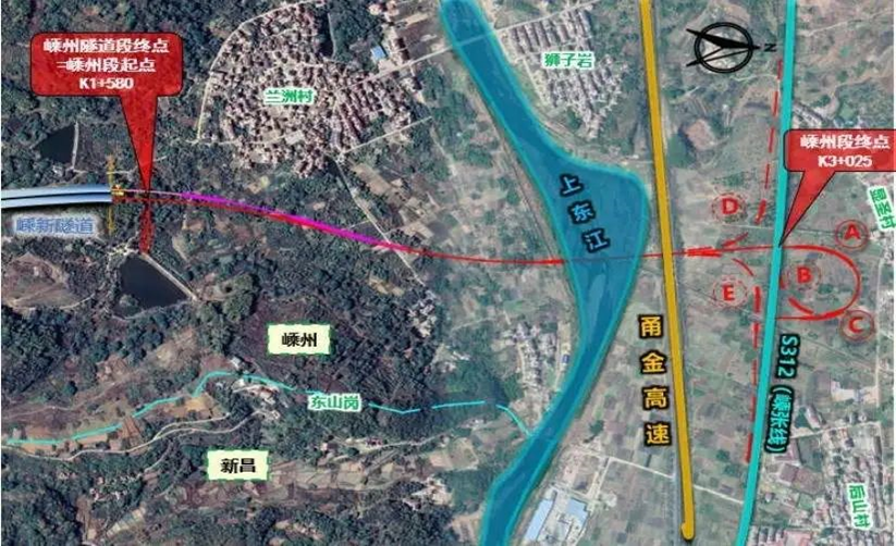 (項(xiàng)目地理位置圖)新昌客貨站至金庭互通連接線工程(嵊州段)起點(diǎn)順接嵊州隧道段終點(diǎn),路線沿蘭洲村東側(cè)布置,上跨上東江、甬金高速改擴(kuò)建工程后,終點(diǎn)接入S312北侖至嵊州公路(嵊張線改擴(kuò)建),利用S312至