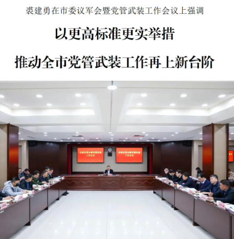 12月9日下午,市委議軍會(huì)暨黨管武裝工作會(huì)議召開。市委書記、市人武部黨委第一書記裘建勇強(qiáng)調(diào),要深入踐行習(xí)近平強(qiáng)軍思想,全面貫徹黨的二十屆四中全會(huì)和省委十五屆八次全會(huì)精神,全面落實(shí)上級(jí)部署要求,以更高標(biāo)