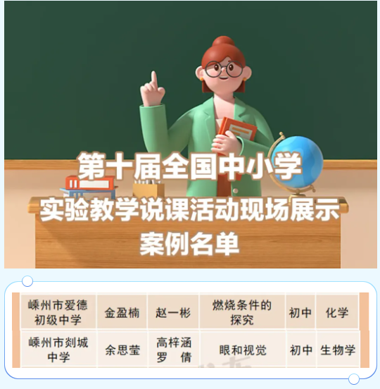 近日,教育部基礎(chǔ)教育司公布了第十屆全國中小學(xué)實驗教學(xué)說課活動現(xiàn)場展示案例名單,共296個現(xiàn)場展示案例入選,其中嵊州2個案例上榜。優(yōu)秀,點贊!嵊州市融媒體中心出品來源:浙江發(fā)布嵊州生活網(wǎng)友情轉(zhuǎn)載,版權(quán)歸