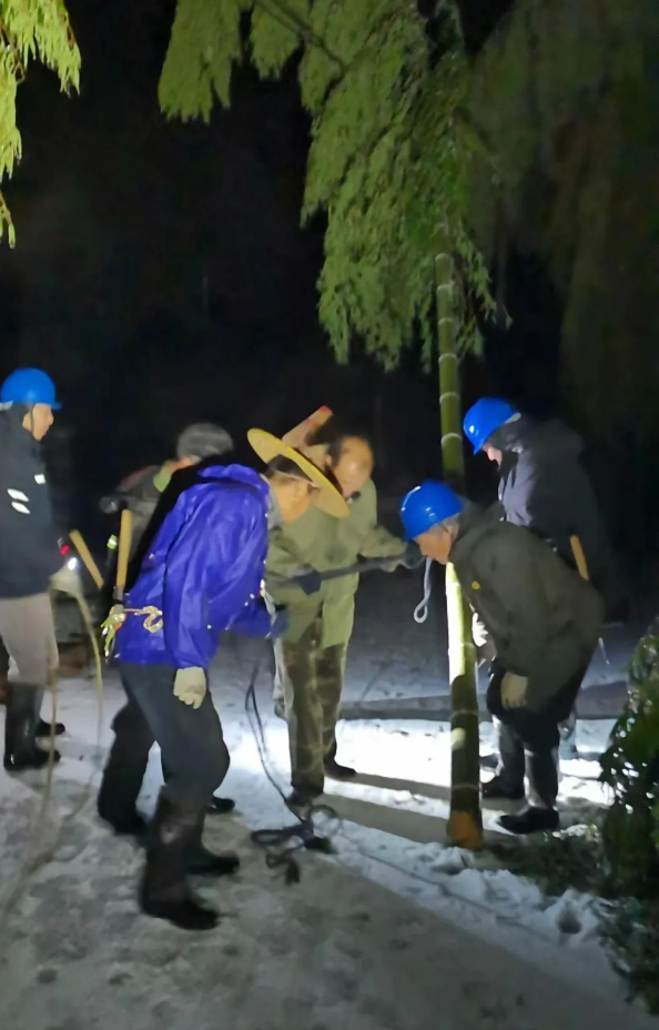 2月22日傍晚,在石璜徐家培高界嶺自然村內(nèi),甘霖供電所搶修隊在徐家培村委會成員的陪同下正在緊張而忙碌地?fù)屝薇淮笱簲嗟碾娋€。夜幕降臨,雪還在不停地下,村委們配合著打開照明燈,搶修隊們爬上覆冰嚴(yán)重的電線