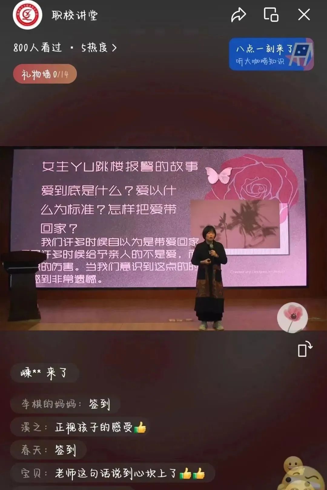 鋒領(lǐng)剡育銳藍(lán)行知第一期家長(zhǎng)講堂2023年11月29日晚上6:30,嵊州市中等職業(yè)技術(shù)學(xué)校第一期“鋒領(lǐng)剡育·銳藍(lán)行知”家長(zhǎng)講堂在學(xué)校微信公眾號(hào)直播了!首先,錢(qián)紅鋒校長(zhǎng)就家庭教育、親子關(guān)系的重要性,以及開(kāi)