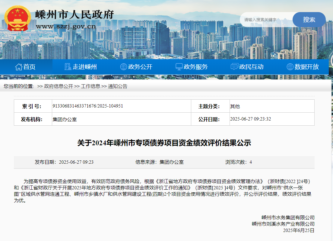 關(guān)于2024年嵊州市專項(xiàng)債券項(xiàng)目資金績效評(píng)價(jià)結(jié)果公示為提高專項(xiàng)債券資金使用效益,有效防范政府債務(wù)風(fēng)險(xiǎn),根據(jù)《浙江省地方政府專項(xiàng)債券項(xiàng)目資金績效管理辦法》(浙財(cái)債[2022]24號(hào))和《浙江省財(cái)政廳關(guān)于