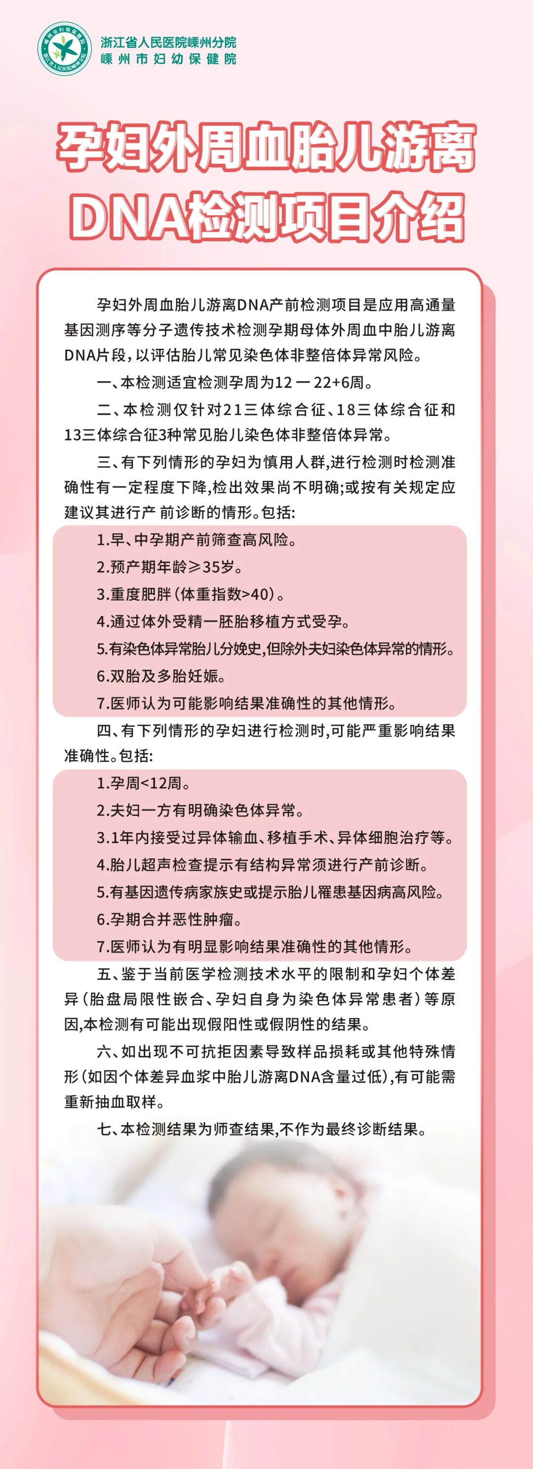 好消息無(wú)創(chuàng)基因產(chǎn)前篩查門(mén)診將于12月11日(下周四)正式開(kāi)診了!有需要的孕媽媽們請(qǐng)相互轉(zhuǎn)告!門(mén)診時(shí)間12月11日開(kāi)始,每周四全天,門(mén)診由婦??苿诶蚶蚋敝魅吾t(yī)師出診。門(mén)診地點(diǎn)門(mén)診二樓產(chǎn)科診療區(qū)產(chǎn)前篩查門(mén)