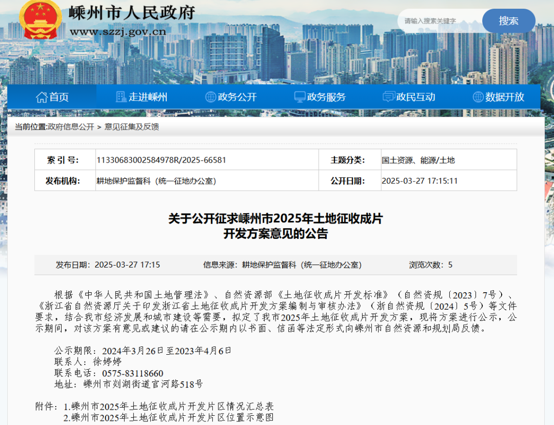 近日,嵊州市人民政府網(wǎng)站發(fā)布了《關(guān)于公開征求嵊州市2025年土地征收成片開發(fā)方案意見的公告》,內(nèi)容如下:根據(jù)《中華人民共和國土地管理法》、自然資源部《土地征收成片開發(fā)標(biāo)準(zhǔn)》(自然資規(guī)〔2023〕7號)