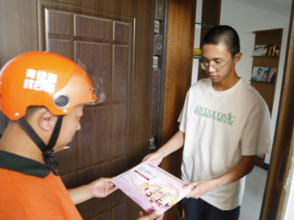 “同學(xué),你好!我是郵政攬投員,這是你的高考錄取通知書(shū),祝賀你,請(qǐng)簽收郵件?!?月20日下午,嵊州郵政攬投員裘樂(lè)永與考生仔細(xì)核對(duì)證件后,鄭重地將一封清華大學(xué)的高考錄取通知書(shū)交到學(xué)生吳卓航手中。標(biāo)志著我市