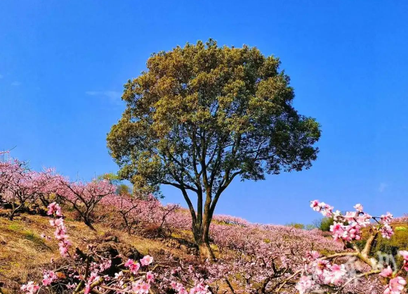 驅(qū)車上山踏著黃泥兩側(cè)夾桃花,迎面吹春風(fēng)綿延的桃花海中孤傲的樹(shù)屹立其中枝葉蒼翠欲滴與周圍繽紛的桃花相映成趣桃樹(shù)下抬頭仰望滿眼都是絢爛的桃花人在桃花海中,仿佛融入了大自然的懷抱,與桃花共舞天空是這片桃花海