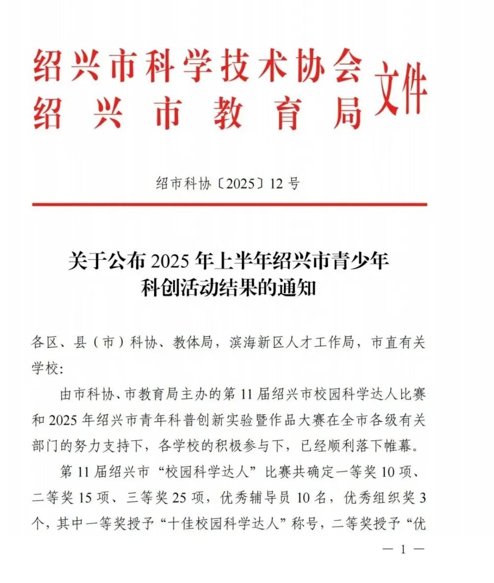近日,由紹興市科學(xué)技術(shù)協(xié)會、紹興市教育局主辦的第11屆紹興市“校園科學(xué)達(dá)人”比賽和2025年紹興市青年科普創(chuàng)新實(shí)驗(yàn)暨作品大賽圓滿落幕。嵊州市廣大青少年學(xué)子與指導(dǎo)教師積極參與、奮勇拼搏,在兩項(xiàng)活動中均取