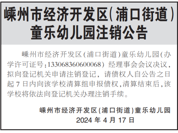 嵊州市經(jīng)濟(jì)開(kāi)發(fā)區(qū)(浦口街道)童樂(lè)幼兒園注銷公告嵊州市經(jīng)濟(jì)開(kāi)發(fā)區(qū)(浦口街道)童樂(lè)幼兒園(辦學(xué)許可證號(hào):133068360600068)經(jīng)理事會(huì)會(huì)議決議,擬向登記機(jī)關(guān)申請(qǐng)注銷登記,請(qǐng)債權(quán)人自公告之日起7日