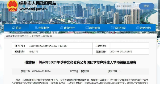 4月16日,市教體局在嵊州市人民政府網(wǎng)站發(fā)布嵊州市2024年秋季義務(wù)教育公辦城區(qū)學(xué)校戶籍生入學(xué)預(yù)警信息。一起來(lái)看看吧!為進(jìn)一步做好嵊州市義務(wù)教育階段招生工作,有效保障學(xué)校的教育教學(xué)質(zhì)量,根據(jù)浙江省教育