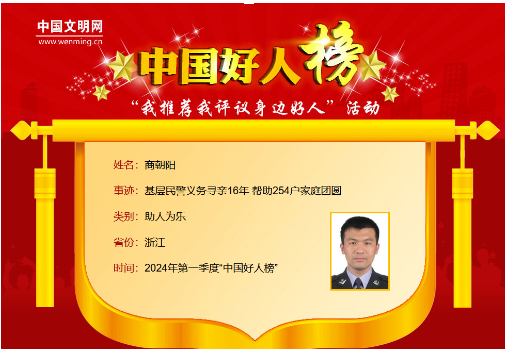 2024年第一季度“中國(guó)好人榜”發(fā)布嵊州商朝陽(yáng)上榜助人為樂(lè)商朝陽(yáng),男,1970年9月生,中共黨員,浙江省嵊州市公安局鹿山派出所民警,浙江團(tuán)圓聯(lián)盟成員單位“和合”尋親工作室負(fù)責(zé)人。從警36年來(lái),商朝陽(yáng)始